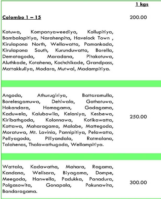Vegetables and Fruits, Fish and Meat & Poultry items delivery service available in Colombo (1 to 15) & Colombo suburbs areas only. we are accepting orders through WhatsApp. 0776928330. below showing delivery charges. we will not accept return.